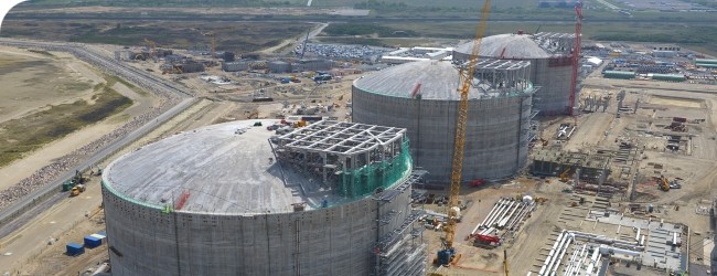 La construction des trois réservoirs a démarré en février 2012 par les travaux de préparation aux traitements des sols. A l’été de cette même année, on assistait au bétonnage des trois radiers et au début de construction des voiles (murs) des réservoirs. Pendant ce temps, les toits métalliques étaient assemblés au sol dans le réservoir, avant d’être levés à l’air, opération spectaculaire, entre les mois de juin et août 2013. S’ensuivait l’installation de l’isolation du fond des réservoirs et la construction des trois cuves internes en acier 9 % nickel, destinées à recevoir le GNL à -163°C, pendant qu’à l’extérieur commençait le coulage des dômes béton suivi par la construction des plateformes en béton en haut des réservoirs qui viendront supporter les tuyauteries.