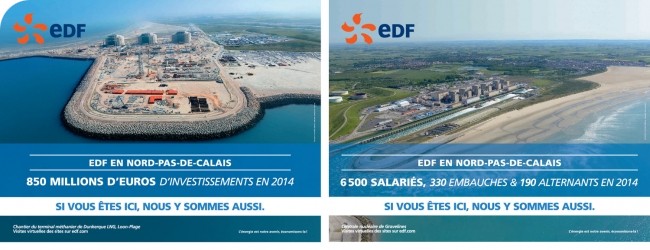 Le Dunkerquois, terre de toutes les énergies est à l’honneur sur les 2 visuels puisque le terminal méthanier de Dunkerque illustre le visuel « investissement » tandis que le CNPE de Gravelines vient illustrer l’affiche « emplois ».