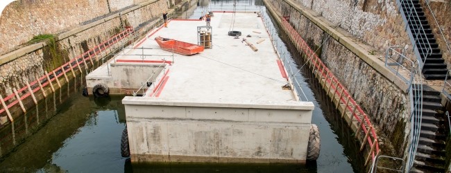La construction du ponton d’accueil des vedettes des pompiers et du remorqueur d’escorte s’est terminée début avril dans le port de Calais, seul endroit du littoral où une cale de radoub, indispensable pour une telle construction, était disponible. Ce sont les équipes de Bouygues TP RF qui se sont chargées de ce chantier, réalisé sous la houlette du Grand Port Maritime de Dunkerque, pour le compte de Dunkerque LNG. Fabriqué en béton armé et rempli de polystyrène, le ponton mesure 37 m de long, 15 m de large et 5,15 m de haut. Installé dans la darse du terminal, il servira de poste d’amarrage des vedettes des pompiers et accueillera également le remorqueur d’escorte qui, pour des raisons de sécurité, doit impérativement accompagner les méthaniers durant tout le temps de leur escale. Le ponton, dont la maîtrise d’œuvre était assurée par Arcadis, devrait arriver d’ici la mi-juillet par flottaison, tiré par des remorqueurs depuis le port de Calais. Il sera ensuite accroché sur ses pieux de guidage dans la darse méthanier. Tout devrait être achevé d’ici la fin-août.