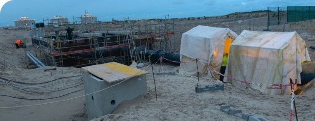 « Les aménagements paysagers sont en cours sur le terminal depuis quelques semaines déjà », précise Pierre Misandeau. « Id Verde, sous-traitant de TS LNG, est en train d’installer les ganivelles. Ce sont des sortes de clôtures en bois, reliées entre elles par du fil de fer galvanisé pour empêcher leur oxydation, d’une hauteur d’1,10 mètre. Elles sont disposées en quinconce, principalement au nord de la zone de la torche et dans le « jardin des Dunes », avec un rôle bien précis : limiter au maximum les envolées de sable afin de permettre une revégétalisation plus rapide du site ». Entre les bâtiments administratifs et les bâtiments techniques à l’entrée du terminal, le « Jardin des Dunes » est également en cours d’aménagement par SEVE Terenvi, sous-traitant de TS LNG. « Ce jardin est composé de végétaux de tailles différentes formant trois strates, qui vont, en grandissant, reconstituer le milieu dunaire. Pour répondre à l’arrêté de dérogation, le choix s’est porté sur des plantes qui favorisent la halte migratoire des passereaux, comme le saule cendré blanc, l’érable plane, le tamaris, le sureau ou encore l’argousier », explique Pierre Misandeau. Par ailleurs, TS LNG et ses sous-traitants procèdent actuellement au réensemencement des graines recueillies sur la couche de surface du sol lors du terrassement des plates-formes par le GPMD en 2011 et conservées depuis en andains. Ce réensemencement consiste à étaler le mélange de graines sur les zones non bâties du terminal afin de dynamiser la renaturation du site. Enfin, des merlons, c’est-à-dire des talus, complétés de gabions (casiers en grillage dans lesquels prennent place de gros cailloux) sont en cours d’aménagement en périphérie de la plateforme prise sur la mer. Il s’agit d’un moyen supplémentaire de lutte contre le risque de submersion marine, réalisé par la société ETNB.