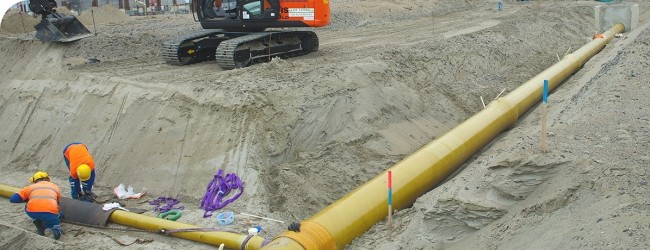 Le contractant TS LNG a attribué conjointement à SADE (Grande-Synthe) et SBPI (Yonne) le lot « défense-incendie ». A ce titre, les deux entreprises sont actuellement chargées de poser l’ensemble des canalisations incendie, soit 7 kilomètres, disséminés dans l’ensemble des zones de la plate-forme du terminal méthanier. « 90 % d’entre elles sont souterraines (10 % aérienne) », précise Sylvain Fricard, directeur régional de la SADE. D’un diamètre allant de 150 mm à 700 mm, les canalisations sont en fibre de verre renforcée imprégnée d’une résine époxy (GRE). Le réseau incendie comprend également la pose de 32 chambres à vannes en béton et de 70 robinets vannes. « Les tuyaux et accessoires des canalisations sont préassemblés en atelier chez SBPI à l’abri des intempéries. Ils sont ensuite acheminés par camion jusqu’au chantier », commente Sylvain Fricard. Les travaux de terrassement, de pose des tuyaux principalement par emboitement mécanique claveté, des essais de pression et de remblaiement sont en cours. Aujourd’hui, 1,5 km des 7 km attendus est terminé. « Notre principale préoccupation, c’est la sécurité », ajoute le directeur régional. « Nous travaillons sur des zones où cohabitent plusieurs activités. Nous devons continuellement veiller à bien délimiter chaque zone de travail afin de prévenir tout risque d’accident ». C’est en ce sens que des réunions se tiennent chaque matin entre TS LNG et l’ensemble de ses sous-traitants qui interviennent sur le site afin d’organiser les interfaces entre les différentes entreprises et de gérer la co-activité. La totalité du réseau devrait être livré en mai 2014. Il aura nécessité 40 000 heures de travail sur site.